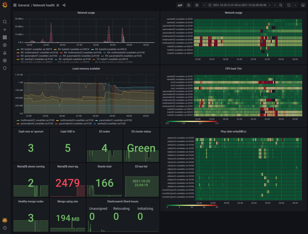 There are lots of “exporters” as clients are called in Prometheus for exporting data about Linux servers and applications and it’s also easy to write your own. I have an exporter for gathering packet loss-data both on my own network and against external servers and it took me like 45 minutes to do, starting with no knowledge of what a Prometheus exporter is or how it works. With a node exporter for something like MySQL and a provided Grafana dashboard you can get really good monitoring in a very short period of time. My MySQL master for instance:
